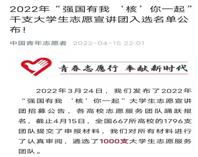 ´óѧÉú¡°Çà¸ë×ÔÔ¸Ðû½²¶Ó¡±ÀÖ³ÉÈëÑ¡2022ÄêÌìÏ¡°Ç¿¹úÓÐÎÒ¡°ºË¡¯ÄãÒ»Æð¡±Ç§Ö§´óѧÉúÐû½²ÍÅ